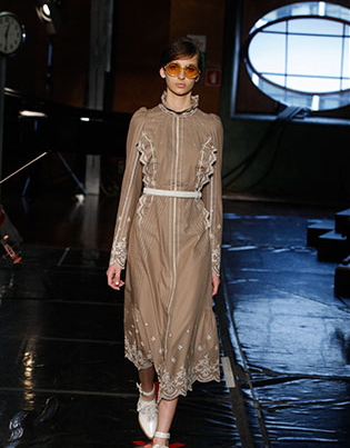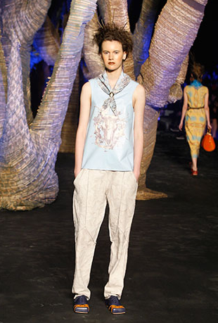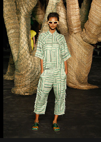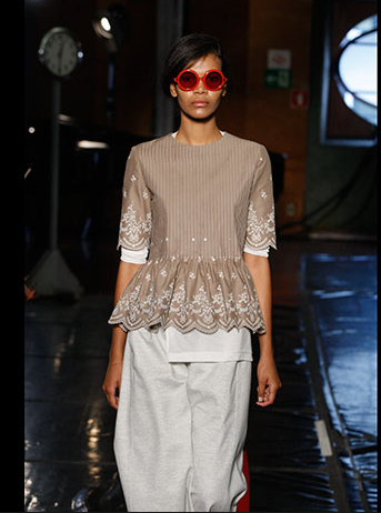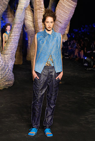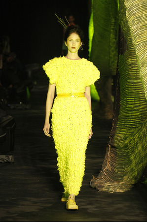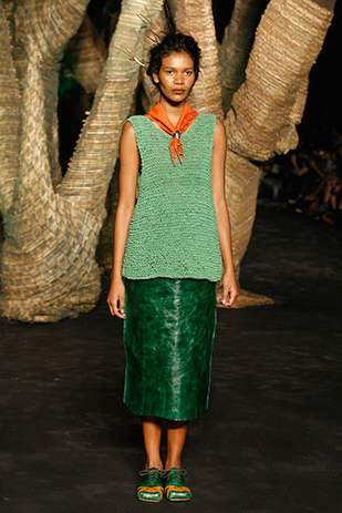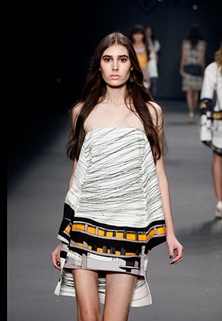 A legendária Carmem Miranda foi a inspiração do desfile de Pedro Lourenço. As peças tinham tecnologia Têxtil. Ele fez uma fusão do tule com o crepe. Os ombros eram marcados e a cintura alta.